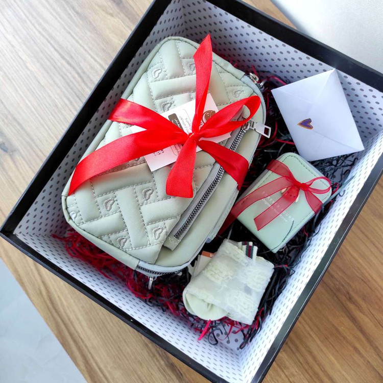 پک هدیه ی زنانه شامل کیف زنانه باکیفیت و شیک و جاکارتی باکیفیت و جوراب مجلسی و کارت تبریک با متن دلخواه شما