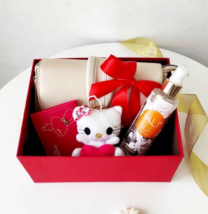 لین پک هدیه ی شیک و کاربردی شامل کیف درجه یک ، جاکارتی ، بادی اسپلش ( که رندوم قرار داده میشود و از بهترین رایحه ها هستند) ، آویز عروسکی کیتی و کارت پستال بعنوان اشانتیون با متن دلخواه شما که در قسمت توضیحات ذکر کنید ، قرار داده میشود