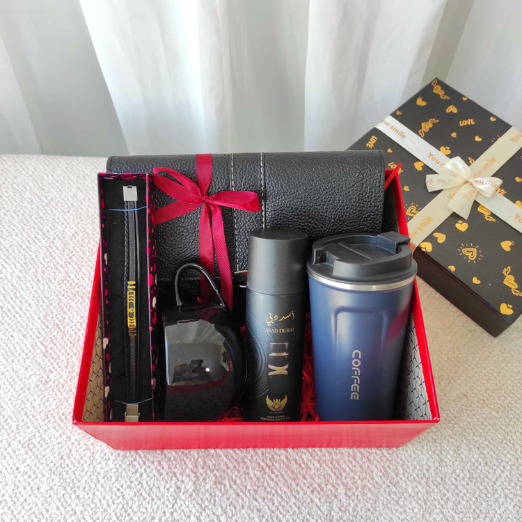 پکیج هدیه مردانه مناسب روز مرد ، روز پدر و تولد با بهترین اقلام مورد نیاز آقایان شامل کیف دستی جادار ، تراول ماگ ، دستبند شیک سه ردیفه ، اسپری خوشبوکننده مردانه با رایحه پرطرفدار و ماگ زیبا و شیک با ارسال سریع سفارش از سایت کیف توربا